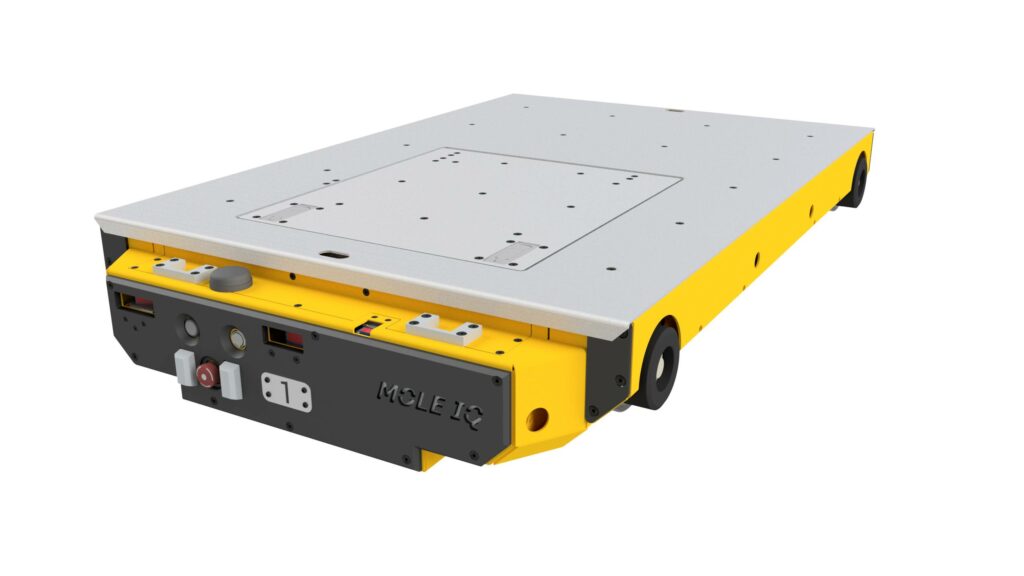 Magnets on the Mole IQ undercarriage auto-engage when the shuttle is lifted by a fork truck, providing security and stability during its transportation.
